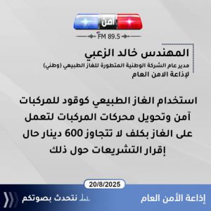 – استخدام الغاز الطبيعي كوقود للمركبات آمن وتحويل محركات المركبات لتعمل على الغاز بكلف لا تتجاوز 600 دينار حال إقرار التشريعات حول ذلك.