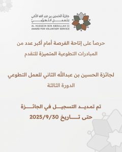 أعلنت لجنة إدارة جائزة الحسين بن عبدالله الثاني للعمل التطوعي اليوم ، عن تمديد فترة التسجيل في الجائزة بدورتها الثالثة حتى الثلاثين من أيلول.
