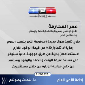 عمان 31 آب (أمن إف إم) – أكد الناطق الإعلامي باسم وزارة الأشغال العامة والإسكان عمر المحارمة أن الوزارة بصدد طرح طرق جديدة وحديثة للاستثمار (تنفذ من خلال مستثمر) ستكون بديلة عن الطرق الحالية وستوفر الوقت والجهد والوقود على مستخدميها وستكون مدفوعة الأجر.