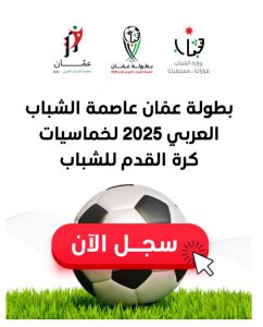أطلقت وزارة الشباب امس ، عبر حساباتها على مواقع التواصل الاجتماعي، رابط التسجيل في بطولة “عمّان عاصمة الشباب العربي 2025” لخماسيات كرة القدم، التي تنظمها الوزارة ضمن فعاليات عمان عاصمة الشباب العربي 2025.