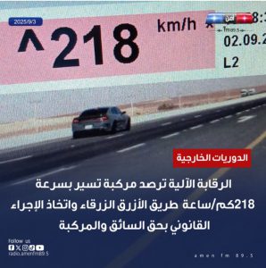 وأشار إلى ضبط مركبة تسير بسرعة تتراوح بين 80-181 كم/ساعة على طريق الحرة. كما تم رصد مركبة أخرى تسير بسرعة تتراوح بين 90-218 كم/ساعة باستخدام الرقابة الآلية على طريق الأزرق الزرقاء حيث تم رصد المخالفة واتخاذ الإجراء القانوني بحق المخالف والمركبة.