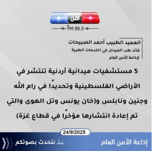 24 من أيلول (أمن إف إم) قال قائد طب الميدان في الخدمات الطبية الملكية العميد الطبيب أحمد الصبيحات إنه وبتوجيهات جلالة الملك تم إنشاء مستشفيات في قطاع غزة وفي الضفة الغربية المحتلة مضيفا أن هذه المستشفيات لم تكن فقط خلال فترة الحرب الحالية وإنما كانت موجودة منذ زمن كالمستشفى الموجود في رام الله الذي أنشئ عام 2000 والمستشفى في جنين الذي أنشئ في عام 2002 ومستشفى تل الهوى شمال غزة والذي أنشئ عام 2009 ولغاية الآن استقبل هذا المستشفى أكثر من 3 مليون ونصف المليون مراجع خلال الفترة منذ إنشائه..