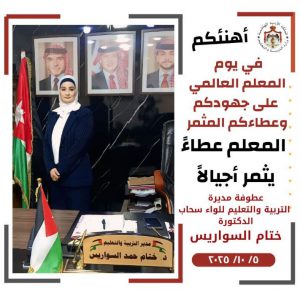 وَجَهَتْ مُديرة التّربية والتّعليم للواء سَحاب الدّكتورة #ختام_السّواريس بِطاقَة شُكر للمُعلّمين والمعلّمات في اليوم العالمي للمعلّم بعنوان : “المُعَلّم عَطاء يُثْمر أجيالًا”