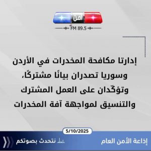 وأكّدتا أنه في إطار التعاون الأمني المشترك بين المملكة الأردنية الهاشمية والجمهورية العربية السورية، وانطلاقاً من الالتزام بحماية المجتمعات من آفة المخدرات وما تمثّله من تهديد مباشر لأمن الأفراد واستقرار الدول، واصلت إدارتا مكافحة المخدرات في البلدين تنسيقهما الميداني وتداولهما للمعلومات الاستخبارية، مما أسفر عن تحقيق نتائج ملموسة خلال المدّة الأخيرة.
