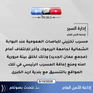 عمان 8 – تشرين الأول ( أمن إف إم ) – أكد مندوبا إدارتي السير والدوريات أنه ومنذ ساعات الصباح الباكر تم نشر الفرق الميدانية على كافة الطرق الحيوية وفي محيط الجامعات والمدارس بهدف تنظيم الحركة المرورية ومتابعة المخالفات الخطرة التي قد تساهم في وقوع الحوادث.