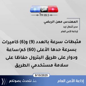 أكد مدير أشغال محافظة إربد المهندس معن الربضي في حديثه لإذاعة الأمن العام على المباشرة بتجهيز تسعة مثبطات للسرعة (مطبات) ووضع ست كاميرات لمراقبة السرعة على طريق البترول في اربد بسرعة حدها الأعلى 60 كم/ساعة وذلك تنفيذا لقرار لجنة السلامة العامة في محافظة إربد بهدف تخفيف الحوادث المرورية وضبط السرعات العالية وتأمين سلامة مستخدمي الطريق.