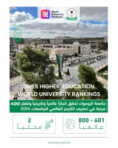حققت جامعة اليرموك إنجازًا عالميًا غير مسبوق بتقدمها ٤٠٠ مرتبة على المستوى العالمي ضمن تصنيف التايمز العالمي للجامعات (Times Higher Education World University Rankings 2026)، حيث جاءت هذا العام – حسب الإعلان الرسمي لمؤسسة التايمز العالمية – ضمن الفئة (601–800) من أصل ٢١٩١ جامعة تم تصنيفها عالمياً لهذا العام، بعد أن كانت في تصنيف العام الماضي (2025) ضمن الفئة (1001–1200).