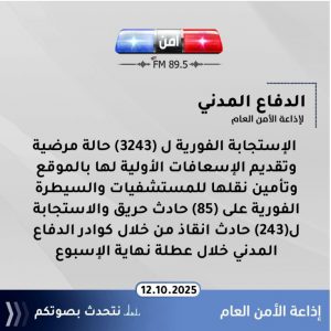تعاملت مديرية الدفاع المدني خلال عطلة نهاية الاسبوع مع (3243) حاله إسعافية مختلفة من خلال تقديم الإسعافات الأولية لها بالموقع ونقل من تتطلب حالته إلى اقرب مستشفى كما سيطرت كوادر الدفاع المدني باحترافية عالية على (85) حادث حريق في حين استجابت فرق الإنقاذ ل(243) حادث.