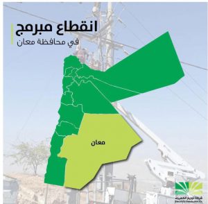 أعلنت شركة توزيع الكهرباء عن فصل التيار الكهربائي عن أجزاء من محافظة معان اليوم ، ابتداءً من الساعة 9:30 صباحاً وحتى 4:00 عصراً، وذلك لإجراء أعمال صيانة على خطوط الضغط المتوسط.