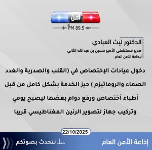 وأوضح الدكتور العبادي في حديثه لإذاعة الأمن العام أن هذه العيادات تهدف لتوسيع نطاق الخدمات الصحية المقدمة للمواطنين وهي عيادات ( عيادة القلب التي تم تزويدها بجهاز إيكو جديد ويشرف عليها أخصائي قلب ) بالإضافة إلى عيادة الصدرية وعيادات الغدد الصماء وعيادة الروماتيزم إلى جانب الصيدلة السريرية .