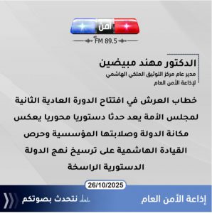 عمان 26 تشرين الأول (أمن إف أم )- قال مدير عام مركز التوثيق الملكي الهاشمي وزير الاتصال الحكومي الأسبق الدكتور مهند مبيضين إن خطاب العرش في افتتاح الدورة العادية الثانية لمجلس الأمة يعد حدثا دستوريا محوريا يعكس مكانة الدولة وصلابتها المؤسسية وحرص القيادة الهاشمية على ترسيخ نهج الدولة الدستورية الراسخة.