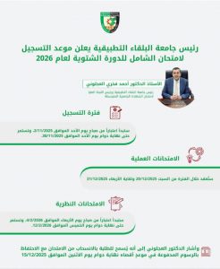 وبيّن الدكتور العجلوني أن فترة التسجيل ستبدأ اعتباراً من صباح يوم الأحد الموافق 2/11/2025، وتستمر حتى نهاية دوام يوم الأحد الموافق 30/11/2025.