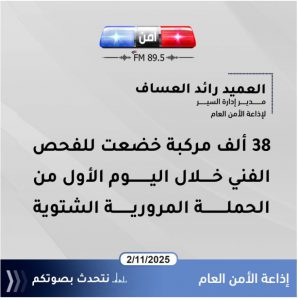 مدير إدارة السير لإذاعة الامن العام : 38 ألف مركبة خضعت للفحص الفني في اليوم الأول من الحملة المرورية الشتوية.