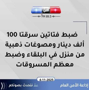 قال الناطق الإعلامي باسم مديرية الأمن العام إنّ فريقاً تحقيقياً من البحث الجنائي ومديرية شرطة البلقاء ومديرية شرطة شرق عمان تمكنوا من إلقاء القبض على فتاتين سرقتا مبلغ 100 ألف دينار ومصوغات ذهبية، من داخل أحد المنارل في منطقة عين الباشا في محافظة البلقاء.