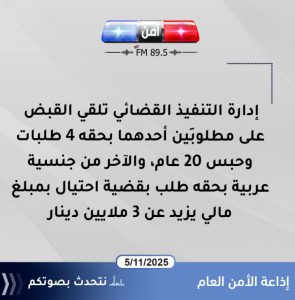 قال الناطق الإعلامي باسم مديرية الأمن العام إن العاملين في إدارة التنفيذ القضائي في محافظة العاصمة تمكنوا من إلقاء القبض على مطلوب بحقه 4 طلبات قضائية ومالية، وذلك بعد البحث والتحري وجمع المعلومات عنه وتحديد مكان وجوده.