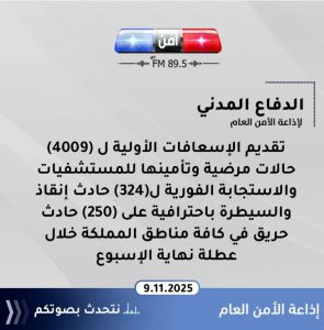 عمان 9 تشرين الثاني (أمن إف إم )- تعاملت مديرية الدفاع المدني خلال عطلة نهاية الاسبوع مع (4009) حالات إسعافية مختلفة من خلال تقديم الإسعافات الأولية لها بالموقع ونقل من تتطلب حالته إلى اقرب مستشفى كما سيطرت كوادر الدفاع المدني باحترافية عالية على (250) حادث حريق في حين استجابت فرق الإنقاذ ل(324) حادث.