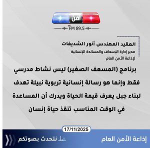 وختم حديثه لأمن إف إم بالتأكيد على أن هذا البرنامج ليس فقط نشاط مدرسي وإنما هو رسالة إنسانية تربوية نبيلة تهدف لبناء جبل يعرف قيمه الحياة ويدرك أن المساعدة في الوقت المناسب تنقذ حياة إنسان مؤكدا التزام مديرية الأمن العام الدائم في نشر ثقافة السلامة المجتمعية والعمل التطوعي وتعزيز وعي المواطنين في كيفية التعامل مع الحالات الطارئة