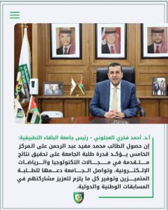 فازت جامعة البلقاء التطبيقية بالمركز الخامس على مستوى المملكة من خلال الطالب محمد مفيد عبد الرحمن في المسابقة الوطنية للرياضات الإلكترونية التي أُقيمت تحت رعاية سمو الأمير عمر الفيصل بتنظيم من الاتحاد الأردني للرياضات الإلكترونية وبرعاية شركة هوبر أب (HoverUp).