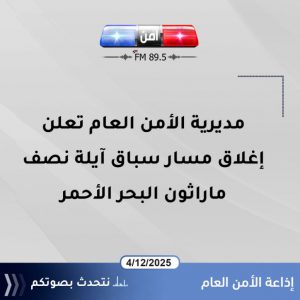 أعلنت مديرية الأمن العام أنه سيتم إغلاق مسار سباق آيلة نصف ماراثون البحر الأحمر ، الذي سينطلق يوم الجمعة في محافظة العقبة الموافق 5 كانون الأول 2025 .