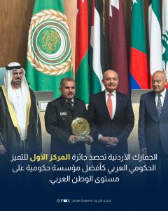 توّجت دائرة الجمارك الأردنية مسيرتها الريادية بفوزها بالمركز الاول بجائزة التميّز الحكومي العربي كأفضل مؤسسة حكومية عربية على مستوى الوطن العربي، تسلمها المدير العام خلال حفل اقيم بمقر جامعة الدول العربية بالقاهرة. بحضور معالي الأمين العام لجامعة الدول العربية ومعالي رئيس مجلس أمناء الجائزة وعدد من كبار المسؤولين وممثلي الحكومات العربية. بعد ان تمكنت دائرة الجمارك من اجتياز عدة مراحل من التنافس بين عدد من المؤسسات الحكومية العربية .