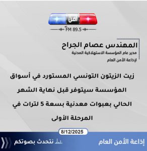 وأكد الجراح أيضا أن زيت الزيتون التونسي سيتوفر في أسواق المؤسسة الاستهلاكية العسكرية ايضا حيث سيكون هناك تنسيق بين المؤسسة الاستهلاكية المدنية والمؤسسة الاستهلاكية العسكرية مع تبادل المعلومات وتوحيد الأسعار بين المؤسستين.