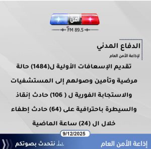 عمان 9 كانون الأول (أمن إف إم )- تعاملت مديرية الدفاع المدني خلال الساعات الماضية مع (1484) إسعافية مختلفة حيث تم إجراء اللازم لهم وتأمين وصولهم إلى المستشفيات، كما تم التعامل مع ( 106 ) حوادث إنقاذ، و(64) حادث إطفاء.