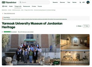 أدرجت كلية السياحة والفنادق في جامعة اليرموك، كل من متحف التراث الأردني في كلية الآثار والأنثروبولوجيا، ومتحف التاريخ الطبيعي في كلية العلوم، على منصة TripAdvisor العالمية، في خطوة هدفت إلى تعزيز حضور الجامعة على خارطة السياحة الثقافية والتعليمية، وتسهيل وصول الزوار والمهتمين إلى المعلومات الخاصة بهذه المتاحف.