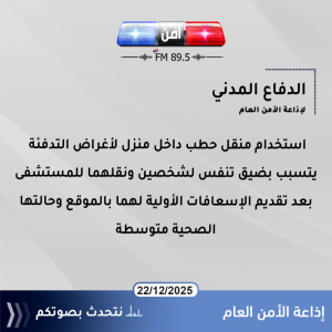 وجدد النقيب السعودي ضرورة انتهاج السلوك الوقائي السليم خلال هذا الايام والتي تترافق مع انخفاض درجات الحرارة وما يصاحبها من استخدام للمدافئ داعيا الى ضرورة عدم النوم والمدفئة مشتعلة وضرورة التأكد من الخرطوم الواصل بين جسم المدفئة واسطوانة الغاز وعدم ترك الاطفال بالقرب منها