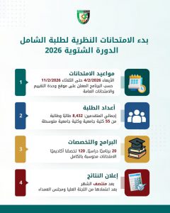 وأضاف، إن الطلبة سيتقدمون للامتحانات في هذه الدورة وفق 20 برنامجا دراسيا، تشمل 120 تخصصا أكاديميا، لافتا إلى أن الامتحانات النظرية محوسبة بالكامل.