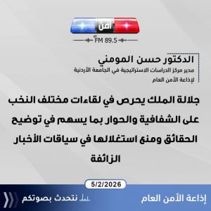 الدكتور حسن المومني مدير مركز الدراسات الاستراتيجية في الجامعة الأردنية لإذاعة الأمن العام : جلالة الملك يحرص في لقاءات مختلف النخب على الشفافية والحوار بما يسهم في توضيح الحقائق ومنع استغلالها في سياقات الأخبار الزائفة.