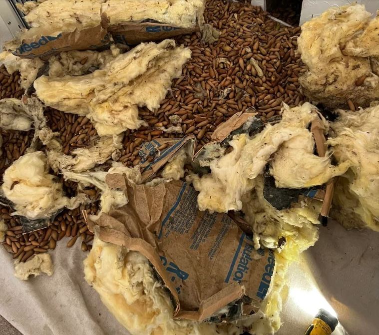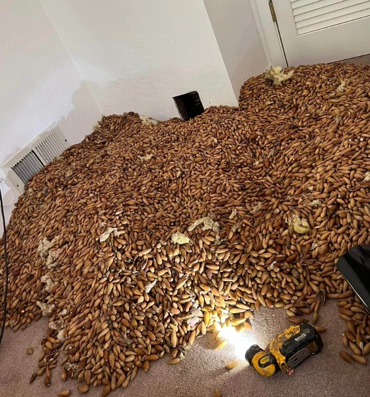 بمجرد أن بدأ خبراء مكافحة الآفات في حفر ثقوب في الجدران الداخلية للمنزل، بدأت جبال من ثمار البلوط في التدفق وكلما قطعوا المزيد من الثقوب، اكتشفوا المزيد من الجوز. في النهاية ملأوا ثمانية أكياس قمامة كبيرة بحوالي 300 رطل من ثمار البلوط.