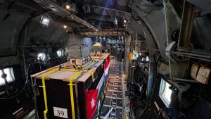 وتضم المساعدات التي تم إنزالها مواد إغاثية وإنسانية وطبية بواسطة صناديق مخصصة مزودة بمظلات موجهة بنظام GPS، بهدف إيصالها إلى المواقع المحددة وضمن التوقيتات اللازمة.