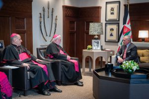 وحمل جلالته، المطران غالاغير تحياته إلى قداسة البابا فرنسيس، مؤكدا عمق العلاقات المتميزة بين الأردن والفاتيكان.