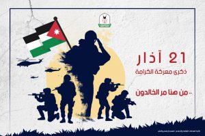 اليوم الخميس 21-3-2024 يُحيي الأردنيون وأحرار الأمة اليوم، ذكرى معركة الكرامة الخالدة، بوصفها يوما أردنياً وعربياً مجيداً في سفر التضحية والفداء التي قهرت الظروف، وكسرت شوكة العدو الاسرائيلي وأسطورة “الجيش الذي لا يُقهر”، فكان له الخسران في يوم 21 آذار عام 1968 على يد “نشامى الجيش العربي”.