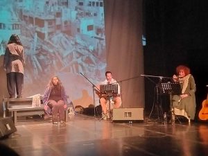 تتمازج الموسيقى مع الأداء المعبر لبطلة العرض الفنانة حياة جابر التي تقدم دور “ثريا”، ومعها هيا قمحية، ومعتصم عازر، وبشار سميرات، وأحمد القيسي، والفنانة اللبنانية مي نصر، إذ تتصاعد الموسيقى الممزوجة بالترويدات الفلسطينية الشهيرة، في تناسق مع سرد الحكاية، التي تشكل إسقاطاً مباشراً على ما يحدث في قطاع غزة حالياً، إذ يبدأ العرض بقيام مجموعة من الناس من تحت ركام البيوت التي سقطت عليهم بفعل القصف، وقد وجدوا مجموعة من الأوراق تسرد قصتهم.
