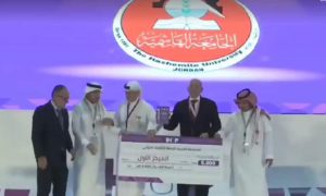 وتسلم الجائزة عن الأردن الدكتور أحمد الرصاصي ممثل صيادلة الأردن في المؤتمر. وتشمل الجائزة بالاضافة الى درع المسابقة باسم الجامعة مبلغ مالي سيتم تسليمه للطالب الفائز.