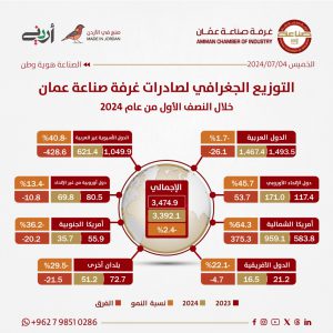 وحسب التوزيع الجغرافي لصادرات الغرفة خلال النصف الأول من العام الحالي 2024، جاءت الدول العربية بالمقدمة بقيمة 1.467 مليار دينار، فالدول الآسيوية غير العربية 621 مليون دينار، والدول الإفريقية نحو 17 مليون دينار.