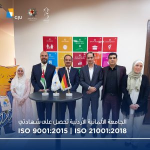 اليوم الإثنين 29-7-2024 : حصلت الجامعة الألمانية الأردنية على شهادتي الأيزو 9001:2015 والأيزو 21001:2018، في إنجاز يعكس التزامها المستمر بالتميز في إدارة الجودة وتحسين أنظمتها. حيث تأتي هذه الشهادات الدولية كاعتراف بالمستوى العالي من المعايير التي تعتمدها الجامعة في خدماتها الأكاديمية والإدارية.