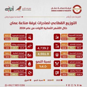 وارتفعت صادرات الغرفة إلى العراق خلال الأشهر الثمانية الماضية من العام الحالي، بنسبة 10.8 بالمئة، لتسجل ما قيمته نحو 609 ملايين دينار، مقابل 549 مليون دينار، خلال الفترة نفسها من العام الماضي 2023.