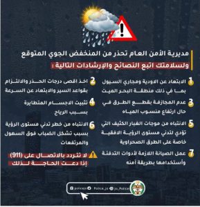30-10-2024 الاربعاء : دعت مديرية الأمن العام المواطنين إلى ضرورة أخذ الحيطة والحذر وانتهاج السلوك الوقائي السليم خلال حالة عدم الاستقرار الجوي المتوقعة في الساعات والأيام المقبلة.