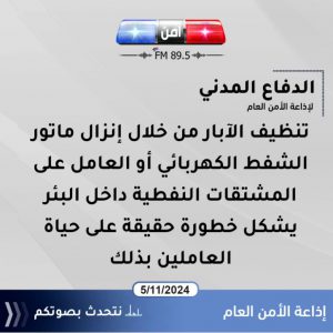 في حديثه لاذاعة الامن العام “امن اف ام” اكد ضابط اعلام الدفاع المدني على ضرورة اتباع الاجراء الوقائي عند تنظيف الابار وذلك بتجنب انزال مضخة الشفط الكهربائي أو المضخات العاملة بالمشتقات النفطية داخل البئر لما قد يسببه من حوادث خطيرة اثناء العمل بداخله سواء كان تماس كهربائي او تسرب للمواد المساعدة على الاشتعال او خروج ثاني اكسيد الكربون او سحب الاكسجين او ابخرة ضارة على الجهاز التنفسي للعامل او اي حوادث قد تؤدي الى الخطورة على حياة العامل .