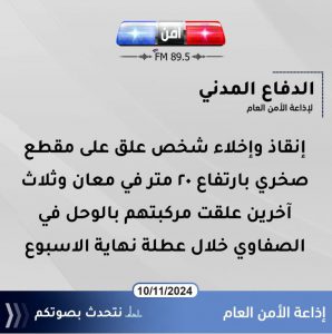 الدفاع المدني لإذاعة الأمن العام : إنقاذ وإخلاء شخص علق على مقطع صخري بارتفاع 20 متر في معان وثلاث آخرين علقت مركبتهم بالوحل في الصفاوي خلال عطلة نهاية الإسبوع.