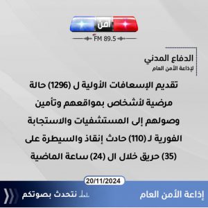 الدفاع المدني : تقديم الإسعافات الأولية ل (1296) حالة مرضية لأشخاص بمواقعهم وتأمين وصولهم إلى المستشفيات والاستجابة الفورية لـ (110) حادث إنقاذ والسيطرة على (35) حريق خلال ال (24) ساعة الماضية.