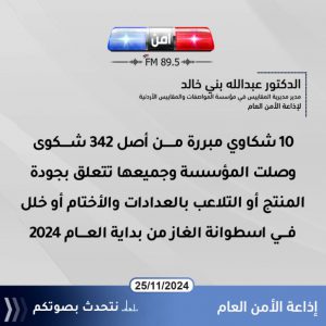 وقال الدكتور بني خالد إنه ومنذ بداية العام وحتى الان وردت إلى المؤسسة 342 شكوى فيما يخص المحروقات بشكل عام من حيث جودة المنتج أو التلاعب بالعدادات أو الأختام أو خلل في اسطوانة الغاز منها 10 شكاوي فقط مبرره والتي تنوعت بين “خلل في المضخات ،خلط مواد بمواد من قبل بعض المحطات.. وتم اتخاذ الإجراء القانوني بحقهم ..