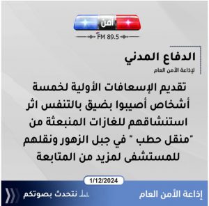 الدفاع المدني لإذاعة الأمن العام : تقديم الإسعافات الأولية لخمسة أشخاص أصيبوا بضيق بالتنفس اثر استنشاقهم للغازات المنبعثة من “منقل حطب ” في جبل الزهور ونقلهم للمستشفى لمزيد من المتابعة.