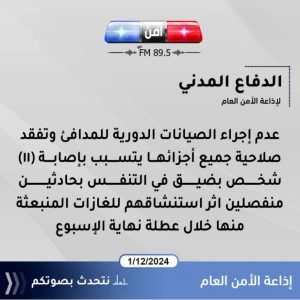 – عدم إجراء الصيانات الدورية للمدافئ وتفقد صلاحية جميع أجزائها يتسبب بإصابة (11) شخص بضيق في التنفس بحادثين منفصلين اثر استنشاقهم للغازات المنبعثة منها خلال عطلة نهاية الإسبوع.