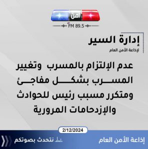 وأكد عل ضرورة الالتزام بالمسرب المخصص للمسير خاصة على مداخل الأنفاق والجسور وأثناء الوقوف على الإشارة الضوئية لتجنب إرباك حركة السير ووقوع الحوادث.