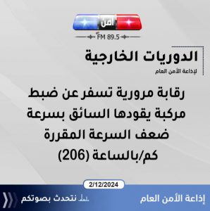 – رقابة مرورية تسفر عن ضبط مركبة يقودها السائق بسرعة ضعف السرعة المقررة (206) كم/بالساعة.
