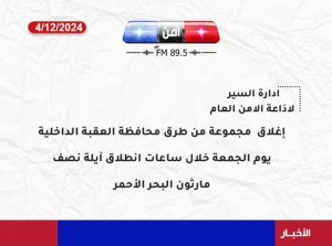وبين أن الإغلاق سيبدأ يوم الجمعة المقبل من الساعة 04:00 فجراً ولغاية الساعة 12:00 ظهراً وعلى النحو التالي
