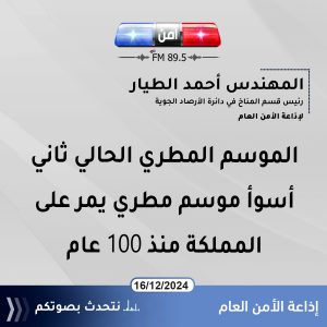 المهندس أحمد الطيار رئيس قسم المناخ في دائرة الأرصاد الجوية لإذاعة الأمن العام : الموسم المطري الحالي ثاني أسوأ موسم مطري يمر على المملكة منذ 100 عام.